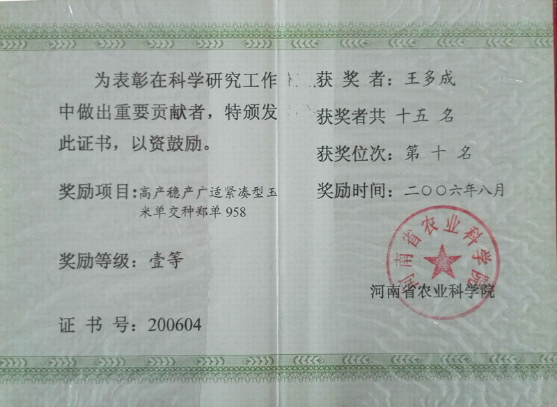 2006年榮獲河南省科學(xué)技術(shù)進步獎